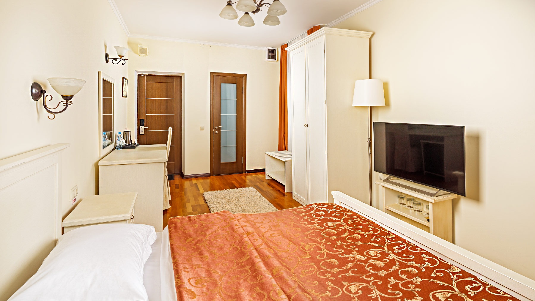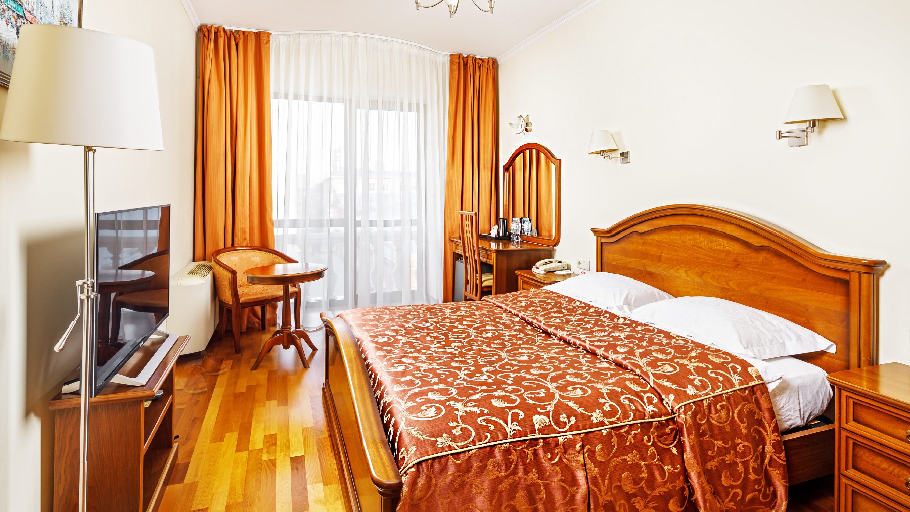 Classic Double Room is a spacious, respectable room, designed for business people who want to ensure the most comfortable stay! All Classic double rooms have an elegant classic interior, elegant Italian natural wood furniture, soft restrained tones in the interior, a comfortable workplace and a large double bed. The Classic Double rooms are bright and have a spacious and elegant living area. A large bathroom with day-lighting and a French balcony has a shower cabin.