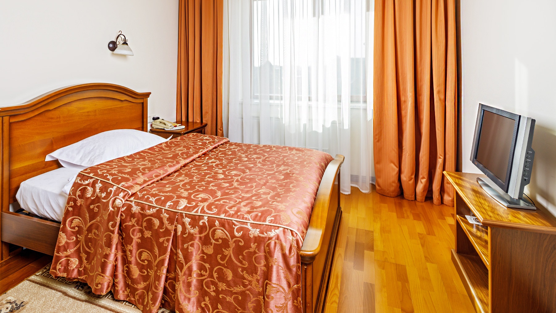 The Classic Single room is an elegant classic interior, which has elegant Italian natural wood furniture, soft restrained tones in the interior, a comfortable workplace, a half bed and stained glass. The Classic Single rooms are bright and have a spacious and elegant living area. The large bathroom has a shower.